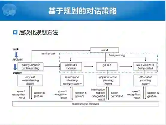 除了刚才的静态或者说规划库的方法和动态的规划之后,还有层次化规划的方法。这个可以看成是基于层次化的对话策略学习的,在规划版本上的扩展。把这个任务自顶向下做一个分解,这个里面涉及到了一个事儿,我要告诉有一个A同学,在寝室楼下阿姨这里来了一个电话,正好A的同寝的人来了,阿姨就说你告诉A同学说有电话找他。这个B同学就要做几件事情,第一件事情要知道A到底是在寝室,在洗澡间还是在厕所。知道A的位置之后就要走到A这块,说你有一个电话在楼下找你,就把这样整个任务分成了三个子任务。总体来说,这种层次化的方法,一方面有一个比较清晰脉络的逻辑。整个规划的方法从上层大的任务分解到子任务,子任务分解到操作,每一个都有相应的属性,跟之前的层次化的方法特别的像。这样的方法还是存在一定的问题,首先对系统的错误比较敏感,鲁棒性比较差。对话策略清晰归清晰,但是相对固定,灵活性不够。第三是策略和任务绑定,很难在任务间迁移,策略决策过程是和任务和领域是强相关的。