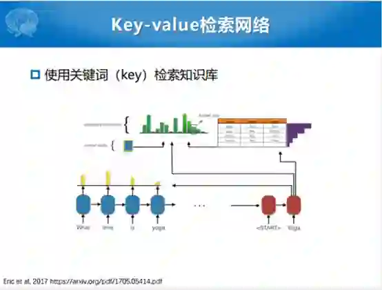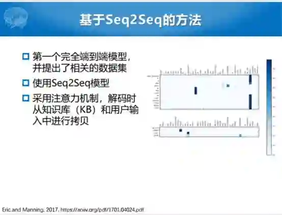 为了想做到完全的端到端,Eric和Manning提出了一个完整的端到端模型和相关的数据集。这种模型不把语义槽东西显式建模,把任务型拆成若干个单轮对话。问你一个问题回答一个槽,把整个过程当中一个一个离散化,变成了用Seq2Seq的模型一步一步的生成。生成过程之中会用注意力的机制,在解码过程中会选当前的输出。因为有一个数据库,这个数据可以认为是所有的任务型对话的数据,无论是状态还是取值的可能性,都包含在数据表达里面。解码的时候就想,解码这句话的时候究竟是从用户输入的词里面拷贝,还是在给定的候选的数据库里面揪一个词出来的过程。整个过程就变成了一个Seq2Seq的过程,生成的话还是像任务型的这种方式。