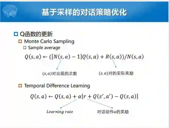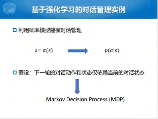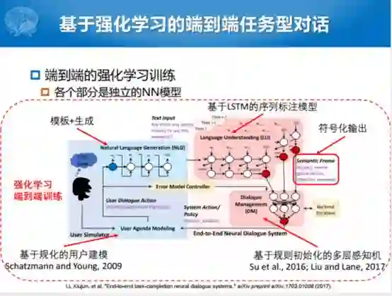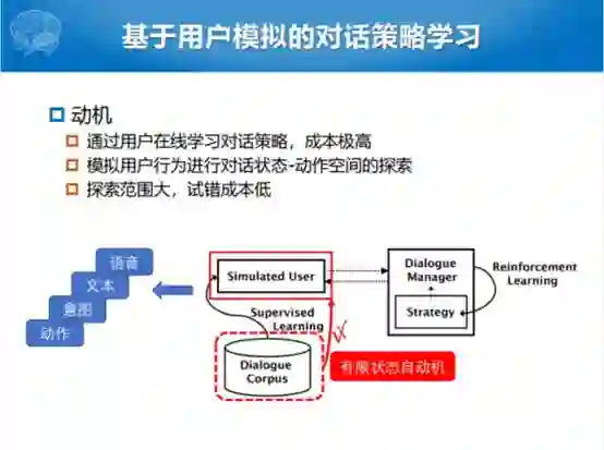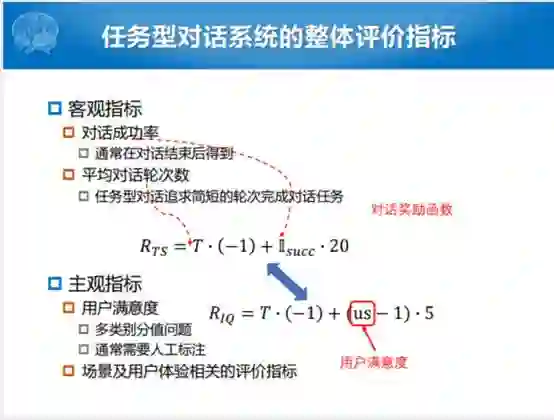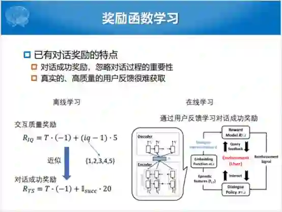我们说基于强化学习的对话管理,通常来说有两个比较重要的过程。一个是我们怎么样让用户能够参与到整个系统的构建的过程中,现在比较火的就是叫Human-in-the-loop。当然这种方式有一种不好,就是确实耗时耗力,那我们不用它的话,初始系统化又不是太好。所以现在比较大的方向就是要有一定人的参与,但是又不能太耗费人力。另外就是怎么样定义对话奖励函数,两个方面,尽可能提高完成的任务成功率和尽可能的减少平均对话的函数。