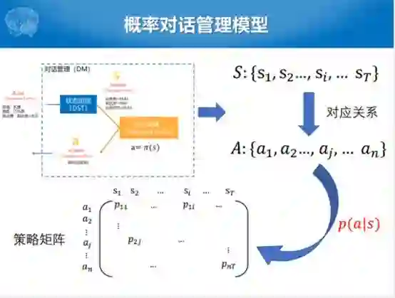 上个世纪或者是本世纪初这一段时间,2000年到2010年之前大家都在想,固定的不行就搞概率的。能不能使用概率对话模型估计从对话状态到动作序列的对应关系,只不过方式就变成了学概率,求解整个对话状态序列和动作序列概率矩阵。每一个矩阵上面的相应位置的元素就对应着给当前状态下给A的状态是什么样的。学习对话策略的过程,其实就是在策略矩阵上面不断优化的过程。