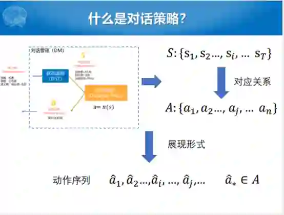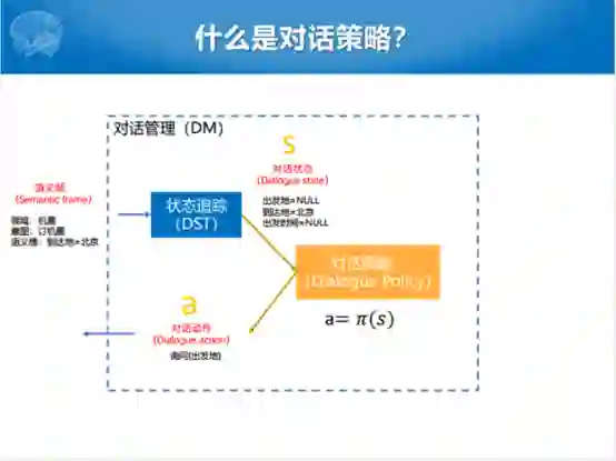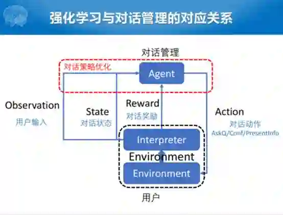 我们关注的就是对话管理这一块,对话管理这一块我们主要关注于对话策略学习的过程。这里面涉及到怎么样去收集或者定义reward,怎么样优化状态和动作之间的关系,当然现在通常来说用的都是Q函数。