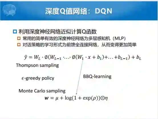 更优化的Q值函数,这个深度Q值网络,最深的时候就是AlphaGo的时候,这个Q函数之前的方式可以用值迭代的方式更新。但是有一个问题,我们怎么样来估计下一个状态S和给定这个A,下一个动作A1的奖励值。传统的方法可以用Bernoulli方程的方式去求解,但是时间复杂度特别高。深度神经网络出来之后,就想反正输入是一个状态和动作,你就要估计一个Q值,我用一个MLP行不行,就把这个对话策略学习形式变化一个前馈全连接网络,从而变得更加简单,不管什么参数都蕴含在W矩阵里面。当然这个训练过程中还是采样的方式,采用采样的方式,去更新那个π函数,我们说用Monte Carlo的方式来更新所有W的参数,这种方式也是后面提到的微软2018年发表的BBQ-learning的方式。