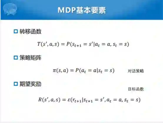MDP建模对话策略的过程分为三个部分。这个策略矩阵就是对话状态和对话动作之间概率的对应关系。上面是转移函数,根据给定对话状态和给定这样当前轮次的对话轮次的动作,产生下一次对话状态是什么样的。我们可以看成是当前状态和下一个状态的转移过程。如果A有所有的对话空间的话,实际上就是一个分布,或者说我们可以把它取成一个从某一个对话状态所有的可能动作的估计。