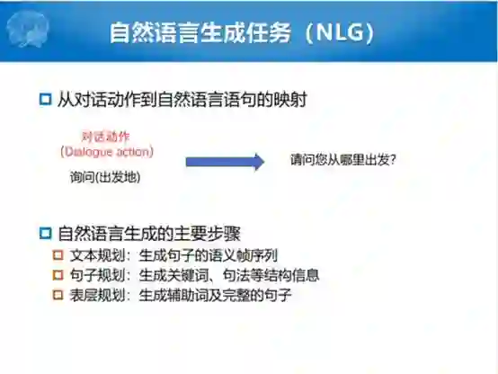 文本输入的句子,通过语义槽的填充之后,就识别出这样一个结果。输入的语言理解的状态,经过中间的对话管理的处理之后,得出来一个对话的动作(action)。比如,我们得出来一个动作是询问出发地,这个询问出发地的对话动作就会输入给自然语言生成的模块,自然语言生成模块就根据这个动作产生一个自然语言文本的回复“请问您从哪里出发”。
