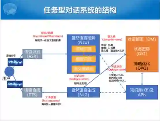 整个的任务型对话的框图里面,除了输入之外,除了语音信号和文本之外,比较大的三个模块就是自然语言理解,对话管理和自然语言生成。对话管理和语言生成的过程当中会遇到知识库和APIs。APIs在实际的应用过程中,可能会调一些查天气和地理位置的APIs,这些都可以被包含在任务型对话资源里面。