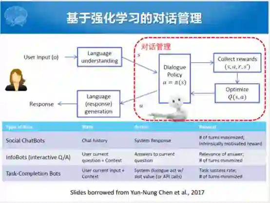 我们把强化学习的比较粗的框架和我们的任务型对话的策略学习相关联的。Action就是对话的动作,系统产生什么样的话。针对用户产生的话,我产生什么反应,我是接受还是反馈,有一个相应的reward。整个对话管理对应着对话策略的优化过程。已有的基于强化学习的对话策略学习或者对话管理这个部分都完成哪些事呢?针对不同类型的,如果是闲聊的,问答的和任务型的,在强化学习框架下面,它的状态、动作、奖励都不大一样。