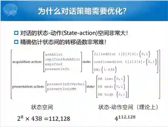 大家可能觉得这个对话状态可能是有穷的,对话动作也是有穷的,为什么要进行策略优化。比如,做好之后就查那个表,给定一个状态之后就查表里面哪一个动作的概率最大。但是通常来说不这么做,通常来说少量数据的情况下表是不准的。所以我们只能不断地训练去更新那个表,当然训练好了之后,实际应用过程中可以进行查表的,怎么样取样,怎么样变得更好。在实际的更新或者是学习过程中,这个对话状态和动作的组合空间是非常大的。
