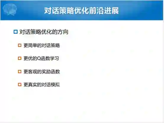 通过刚才的介绍,看到有几方面。首先就是怎么样定义,或者怎么样初始化,怎么样更新这个对话的策略,以及采用什么样的Q函数去学习。我们有没有更优化一点的Q函数的学习方式?还有没有更客观的,就拿任务完成的方式和对话轮次的方式定义这个奖励函数,有没有更好一点的。比如说你同样是两个系统,以同样的任务完成率完成一个任务,用户就是喜欢用你的,但是已有的奖励函数就没有定义,所以我们想优化的方向,其中一个方向就是能不能够更好地定义更客观的一个奖励函数。最后一个方向,就是我们刚才说的对话模拟,我们怎么样让这个对话模拟器更接近于人。最简单的实现方式就是用这种有限状态自动机的方式去训练模拟器,用模拟器访问数据库,不断地问模型这个问题,整个过程中提升模型跟人的交互的能力。最后一个就是可能优化的方向,也是最近有进展的方向,就是能不能有更真实的对话模拟器。