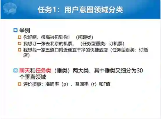 最后介绍一下我们中文人机对话技术评测,我们举办第三年了,联合了科大讯飞和华为。这里面有几个任务,每一年推出两个任务。第一个就是用户意图分类,对于一个对话系统或者任务型对话系统来说,不可能就处理一个领域的事,手机上的Siri可以让它查天气,可以搜索,还可以问有没有日历或者信息的需求。我们认为每一个东西都是一个Domain。Siri要做的第一件事就是我们要分到哪一个Domain去处理,如果查天气一定不能弄到定闹钟那里去,我们就想做这个任务。科大讯飞第一次给我们的数据,相对来说比较简单,我们有31个类。两个大类要么是聊天,要么是任务类。任务类下面细分为30个垂直领域,你给我讲一个笑话,还是讲一个故事都算是一个垂直的领域。实际上这个任务就是做31分类的任务。