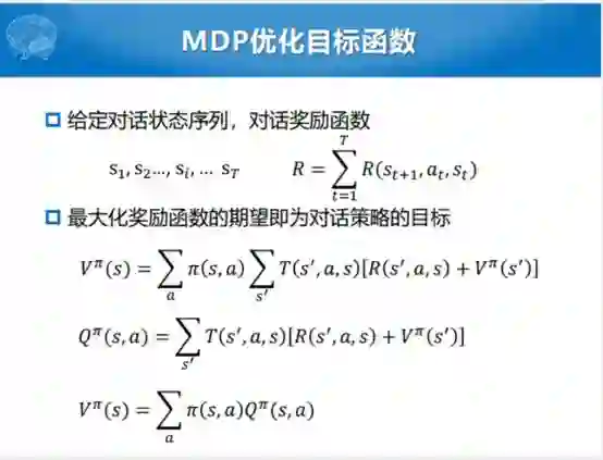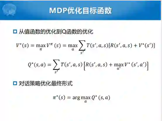 整个过程也比较简单,目标就是用MDP的方式给定对话状态序列,优化对话奖励函数。整个过程就是要建模期望,这个期望就是整个基于值迭代方式的这后半部分。这部分可以认为是奖励,这部分可以认为是状态转移的函数。