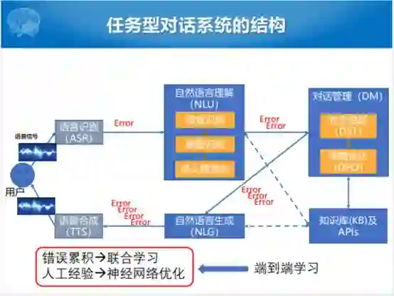 随着技术发展的过程,把这种Pipeline的方式从头到尾的生成,走了一圈的技术模块把回复返回给用户。这个过程中有一个问题,在语音识别和自然理解过程当中有错误,这个错误传到DM这块就会叠加,DM再传到自然语言生成还会叠加,自然语言生成再往语音合成还会有错误,这就是错误累积的过程。能不能联合学习的方式,整个的错误累积的过程能不能用神经网络优化方式取代这种人工接待的方式。研究端到端学习的人就开始做工作了,端到端成为一个黑盒,整个系统不要那么多步骤。