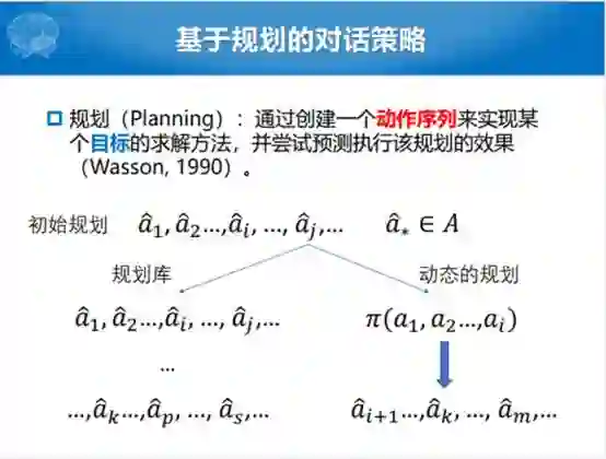 后面就是基于规划的方法。什么叫基于规划的方法?Wasson在1990年的时候给规划进行了一个定义,通过创建一个动作序列来实现某个目标的求解方法,并尝试预测执行该规划的效果。创建一个动作序列就是人机对话中的若干问题和若干回复,最终实现的目标是帮人完成相应的任务,后面的人就想能不能通过规划的方法来做对话策略的学习,也就是后面的基于规划的方法来求解对话策略学习的过程。
