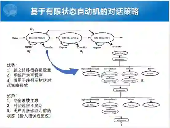 这个是最开始的MIT做的工作,当然这个ATIS的对话系统尽管比较早,对后面的影响比较大。另外一个比较早期的,基于有限状态自动机的对话测录。比如,说在搭建工业级或者对话流程控制没有那么复杂的场景下,有穷状态自动机的对话策略现在还在广泛的应用。整个过程就是把对话和对话状态之间的转移过程看成有限状态自动机,可以转换成一个树形结构。这种有穷状态自动机有什么好处呢?状态转移很容易设置,有状态转型的图模型,就转成树形的结构。整个系统是可预测的,适应用树状的策略决策模式。劣势也是比较显而易见的,跟ATIS没有特别大的区别,完全是系统主导的,人要配合系统,对话的状态不是特别灵活,用户没有回退的机制。