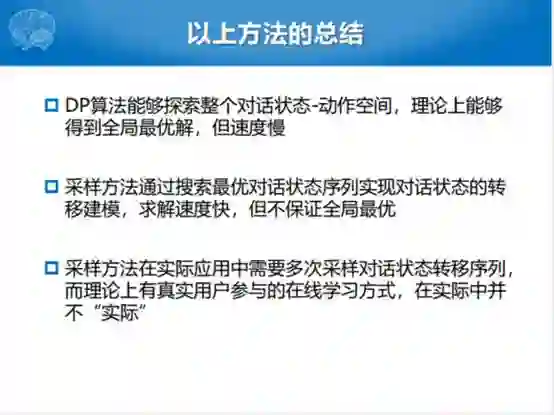 总结一下对话策略学习的方式有哪些优缺点。首先DP动态规划的算法要搜索整个状态空间,效率比较低,但是通常来说能够达到最优解。采样的方式不一定能够达到最优解,通过实际的图也可以看到实际的效果还成。另外采样的方法在通常的实际的过程中,不是一次采样就结束,需要多次采样的方式。如果这样采样的方式把人融合进来的话,或者拿到真实用户反馈情况的话,多次采样也不是很实际的。每次采样尽管比动态规划的方式访问的空间低,但是也有很大的状态空间,不能拿这样的状态空间进行反馈。所以我们说整个的实际理论上有真实用户参与学习的方式下,这种采样的方式也不是特别实际。有没有相对来说不需要人介入那么多,还能在整个过程当中比较实际应用起来的呢?既然真实的用户用不起来,我可以用一个模型进行左右互博来学习。这种方式,如果大家对阿尔法的算法有所了解,媒体上也宣传AlphaGo左右互博自我更新的过程,就是说的用户模拟器的过程。整个用户模拟器的动机就是没有办法用大量的人,即使是采样也没有办法进行在线的对话策略学习,产生对话状态你就给我一个分数,不切实际,成本比较高。