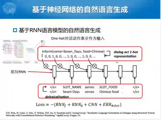 后面到了深度学习的时代,这是2015年的时候,很自然的方式就是统计语言模型可能有一个局部的相关性。我们用RNN的方式建模整体的特性,用双向的RNN做了一下,整个过程分为两步走,跟规划的方式前两步捏在一起,前两步捏在一起之后,有一个去词汇化的过程,把这个槽和值抽出来,抽出来这样一个方式,抽成slot name和slot food这样的方式。通过这样的方式之后RNN建模,等到最后形式的时候,其实跟上一个自然语言生成的方式有点像,只不过最终用RNN生成模板,再通过对话已有的状态和对话采集到的语义槽的值,生成自然语言句子的时候,把值填进去。这个过程跟之前比较相似,但是比较好的就是采取了双向RNN的模式进行的语言模型的生成。