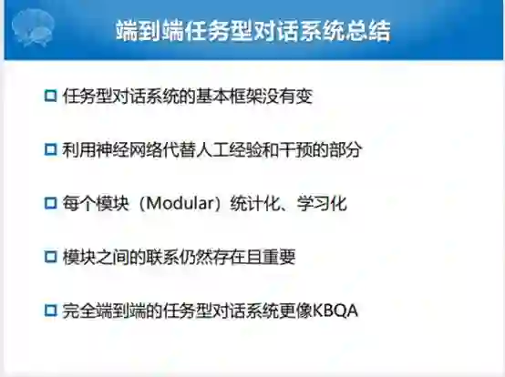 最后总结一下端到端任务型对话系统的状态。任务型对话系统整体的基本框架还是没有变。但是在端到端这块的努力,最有效的尝试就是在每一个过程当中用一个端到端的模型去训练,但是整体上面要么用Pipeline的方式,要么用强化学习串起来,每一个模块都进行统计化、学习化,模块之间的联系仍然存在而且必要。