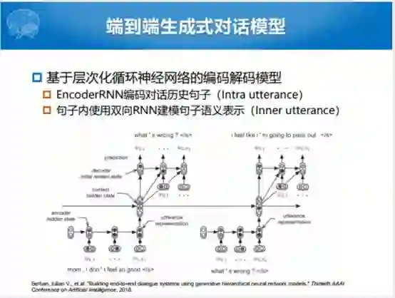 实际的状态就是端到端的生成式对话模型,最开始可以看到的不是任务型的对话,是开放域的对话,是2016年蒙特利尔大学他们提出的模型叫做HRED的模型,这样一句话建模的时候,你可以从第一个词建模到最后一个词。如果你说给你一个对话历史,建模多轮的情况下,建模整个的对话历史,建立多轮的形式下,给我一个合理的回复,怎么样建立对话历史。他们就提出一个简单粗暴的方式,句子和句子之间也用RNN去Encoder。