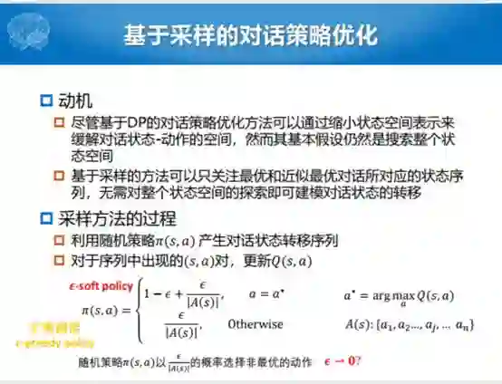 自然而然就想到能不能采样一下,不一定每一次都求全局最优解,就求最近的最优解就可以了。比如说利用随机的策略,随机的初始化对话的策略,我们用π表示对话的策略函数,对于序列中出现的训练数据中的(s,a)对,就是状态和动作之间的组合对,然后更新Q函数。这里面a*表示的是当前使得这个Q函数达到最大值的动作状态的A是什么样的。我们当前选择到A等于最优状态A的时候,我们就以这样对话的方式更新已有的矩阵。总之这是一种比较简单的方式,这种方式叫做epsilon-soft policy。大家更多的听见的是叫epsilon-greedy,但是这个epsilon-greedy跟这个类似。