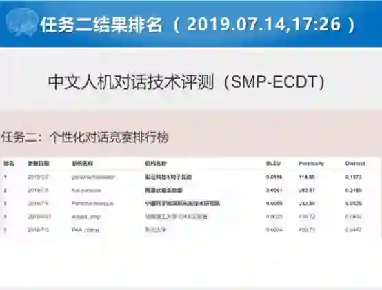 任务二是闲聊的项目,我们前两届都没有引入闲聊的项目。这届我们想能不能引入一个开放域对话的任务,这里面引入了一个个性化对话生成的任务。这个任务就是我们给定一个人与人之间对话的数据片断,给出两个用户,这两个人若干属性的属性值。你拿这个做一个训练数据,测试的时候给你一个属性的值的时候,你要能够生成和属性值不矛盾或者一致的对话。这就是考验对话系统,通过显式的对话的个性信息来建模生成符合属性信息对话的能力。这个也比较难,从头到尾大系统都比较难,最后成功提交有5家。