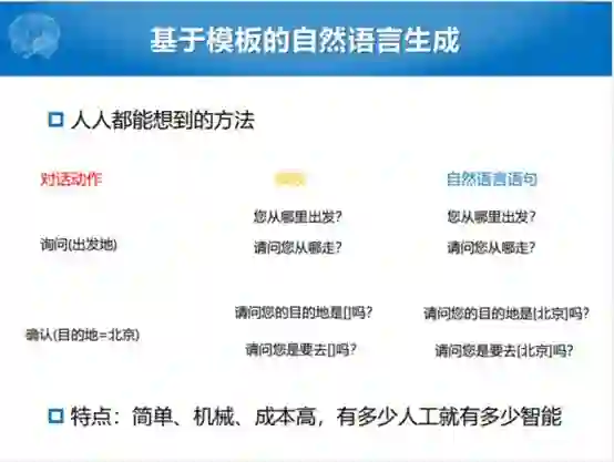 还有比这个更简单的方法,是什么方法呢?就是写文本,反正对话动作是有限,询问出发地或者确认目的地,雇两个人写一条给一块钱,你就写吧,询问出发地。一个人写“您从哪里出发”,另一个同学写“请问您从哪里出发”,确认目的地还是两个人分别去写,当然这个里面会把相应的目的地的槽空出来。总之我们雇了一些人,就能够实现我们这个目的,假如对话系统够简单,我们再用比较简单的策略选择的过程的话,搭起任务型对话系统挺简单的,特点就是简单、机械,成本有点高,你得给标注者一定的钱,有多少人工就有多少智能。