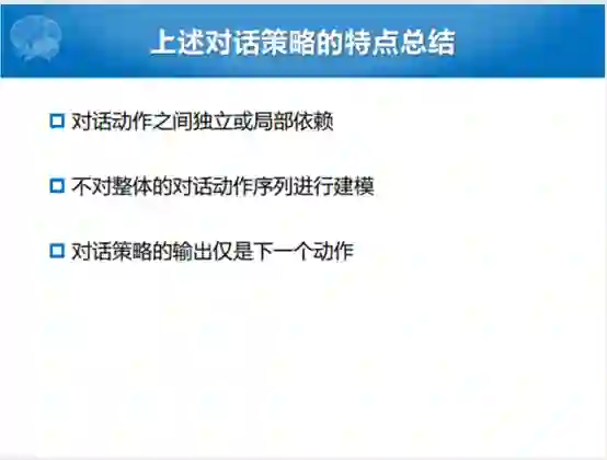 总结一下上面介绍的。无论是基于规则的也好,还是基于流控制的,还是有限自动机的。对话的动作之间是独立或局部依赖,以及不能对整体的动作序列进行建模,只能一个动作一个动作进行建模。另外就是对话策略的输出是一个确定的,就是下一个动作,而不是下一个动作在所有的动作空间上面的概率分布,这也是目前已有的之前讲过方法的几个不足的地方。