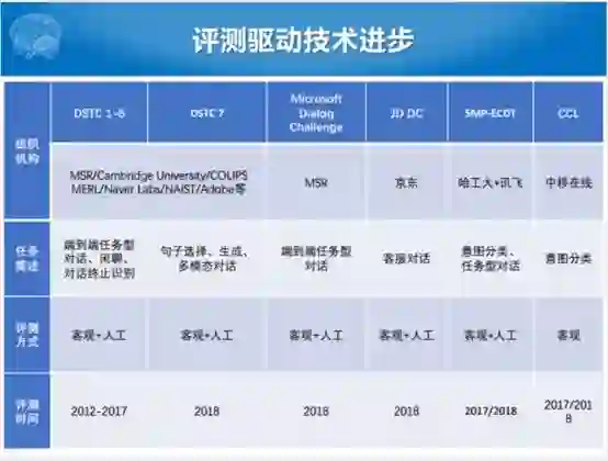 最后我们给一些对话技术评测的介绍,每一个相应的评测都有相应的数据集,如果感兴趣的话可以下载这样的数据集做做这样的任务。