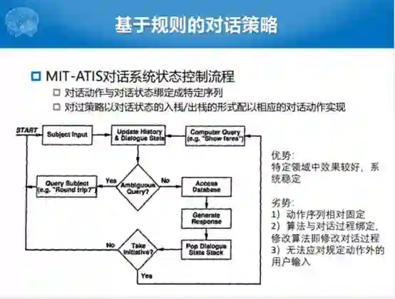 可以看到整个的方式其实就是一个比较偏向于规则的对话控制流程。在特定的领域或者特定比较小的任务上面,效果比较好。而且系统比较稳定,规定了这样的流程,规定了状态的转移的过程,就做的比较好;劣势也比较明显,动作状态序列都是固定的。算法与对话过程绑定,修改算法即修改对话过程。然后必须规规矩矩地按照系统的提示回答问题,否则流程就无法响应我们的需求。