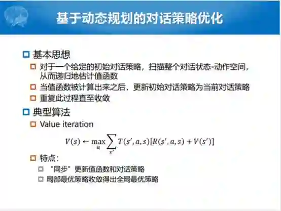 比较简单的方式就是我们用动态规划的方式。这有一个好处,大家学过算法都知道,动态规划有一个好处就是算过的东西不用再算了,下一次直接拿过来就行了。基本思想就是给定一个初始的对话策略,假如说每一个都是均匀分布的,都是1/N,给定一个初始化的状态之后,扫描整个对话状态和动作空间,从而递归地估计值函数。典型的方式就是值迭代的方式,通过后一个状态的值,定义前一个值,这种方法也是往前看一步,尽管当前的值不知道怎么回事,但是可以往前看。真正选择下一个状态的时候,递归往回带的时候,可以选择下一个状态里面值最大的状态把它带回去。当值函数被替代之后,不断地重复,直到把对话状态都计算一遍。