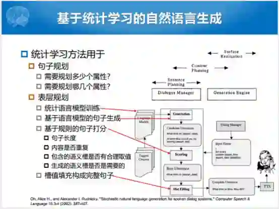 其实通常来说,我们都不会这么做,最简单的方式就是流水线式规划生成自然语言生成。通过这种Dialogue manager已经产生了对话的动作,然后还是“三步走”,第一步生成一个语义帧的序列,这种序列里面包含着我要生成什么样的句子。我现在就要生成一个确认句子,确认句子之后,要生成一定的句法、关键词和结构化的成分,这个部分相当于把句子主干拼出来了。然后往这个里面塞助词、标点符号、感叹号,最终通过这个“三步走”的方式,把自然语言的句子分出来了。当然如果是一个语音对话系统,最后还要把文字转化成语音播出去,如果是文本的话,直接把完整句子反馈给用户就完事了。除了流水线式的规划的方式之外,因为我们说这是2001年左右的工作,后面到了2002年我们能不能用一些统计学习的方式代替一下部分的流水线的规划方法的某一个模块,就出现了这种方式。