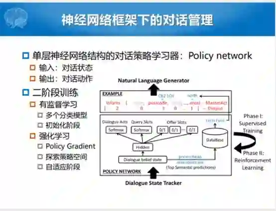 接下来就是分四个工作分别介绍一下四个方向的进展。第一个进展就是更简单的对话策略学习的方式。现在随着2014年深度学习火起来,大家就给出一大套对话策略估计的方式,有深度学习,深度神经网络。能不能用深度神经网络的东西做这个事情,一个想法就是用单层的神经网络结构的对话策略学习器。最开始就是Policy network的方式,这个也是非常的纯粹,输入就是对话状态,输出就是对话动作,所有的智能都是参数里面蕴含着,整个架构就是这样的架构。然后我们忽略上面的NLG的过程,实际它的输入就是state,输出就是Act。每一个阶段是总归有少量的或者上千条的人人对话数据对,我拿它做一个初始化,初始化的过程中是有监督的学习,我们通过这种方式来学习到对话的动作的分布是什么样的,当前的Query里面蕴含着哪些slot也是用这个估计的,以及需要问用户哪些问题,每一个过程都是一个独立的二分类的过程,通过这样的方式先训练一下。再一个过程之中就有Policy的强化学习和方式,不断探索这个策略空间,就是初始化加上后学习的内容。