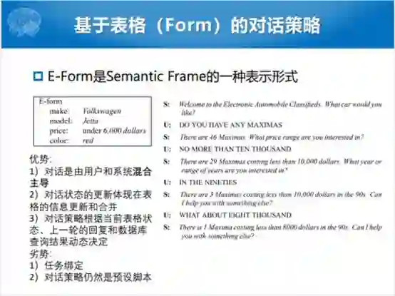 后面就出现了基于表格的对话策略。这种对话策略跟现在的策略比较相似了,有点类似于语音提取信息的方式,就用表格的形式表示对话的信息。整个过程有一个好处,我们人和机器可以混合主导,我们可以问机器一些问题,机器在这个过程当中也会问人的问题。不断地维护、更新表格的信息。表格上的信息有一个好处,我们可以更新。假如说这一轮说错了,下一轮还可以更新出来,这个更新的就在条目上。首先是混合主导,再就是容错性比较好且可更新。劣势是整个过程需要一个预设的脚本,就像我们说的系统生成的话都是预设的。根据什么样的上半句,拼接后半句,也不够灵活。