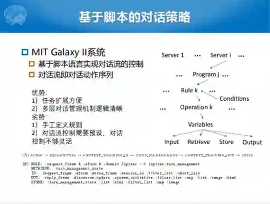 还有一个把脚本用到了对话策略的例子。MIT的Galaxy2是通过脚本流控制的,表格的形式没有一个明确的结构的过程,是通过不断地更新的过程,最终找到上面还有什么信息,缺什么信息,更新了什么信息,最后给你什么信息。但是这个Galaxy2有一个明显的自顶向下的规划结构,把这个大的Domain意图当成server,然后把Domain下面的一些意图当成Program。对每一个下面的这些语义槽当成更下层的规则。最后针对每一个槽或者针对每一个意图规定了一些若干个操作,比如有输入操作,有检索操作,有存储操作,有输出操作。一个脚本化或者流化的对话控制就是这样一个过程。我们看每一个节点都是对话的动作,但是这种对话动作序列的过程不是自动化生成的过程,而是由脚本控制的。这个也是一样的,下边四个变量,rule是什么样的,Input、output怎么实现的。它的优势就是任务扩展方便。多层的结构有点像现在的层次化或者是Domain到意图再到槽的自顶向下的构架,逻辑比较清晰,任务扩展相对方便一些。劣势就是这些规则都是手工定义的,对话流控制需要预设,也没有可学习的过程。