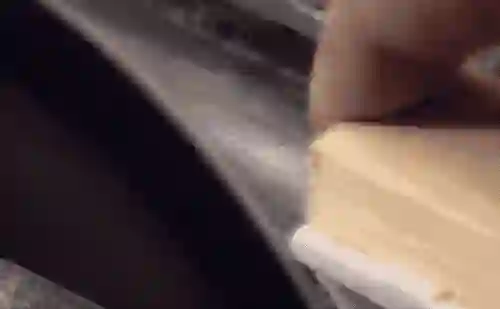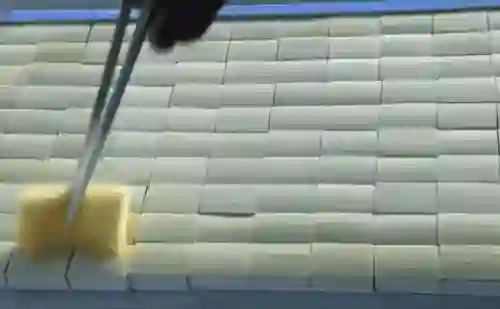 此时麻将的竹表面颜色还不是一致的,需要进行漂白处理统一下色号,让打麻将的时候没人能记住牌……下图就是用浸泡过强力漂白剂的海绵,对麻将的竹表面进行仔细擦拭。