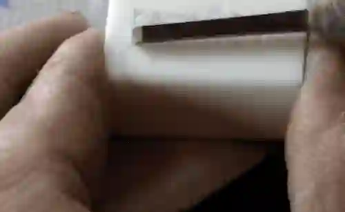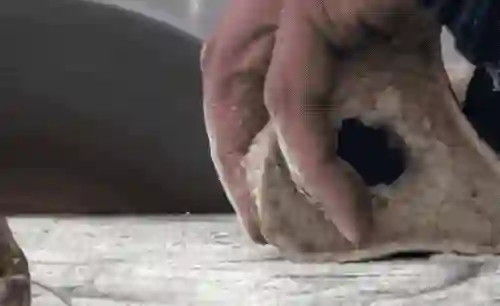 下一步是把弯曲的骨头弄得平整。把骨头的直边缘顶向砂轮,先是把凹面给磨平了。