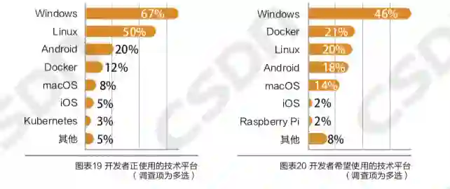 而后为Android(20%)、Docker(12%)、macOS、iOS,Kubernetes也有3%的人在使用。