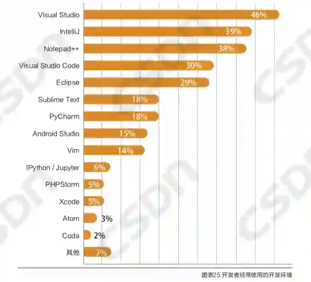 在操作系统方面,72%的开发者在使用Windows,18%在使用Linux操作系统,只有9%的开发者在使用macOS,其他操作系统占据剩下的1%。