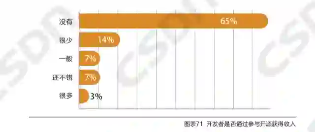 有趣的是,调查报告显示,中国开发者从开源这件事上并没有获得很直接的利益和收入,65%开发者表示不曾在开源上获得收入,在开源上获得不错收入的仅占10%。