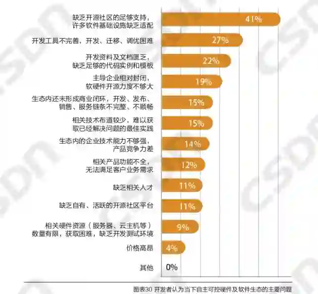41%开发者认为当下自主可控硬件及软件生态的主要问题是缺乏开源社区的足够支持,许多软件基础设施缺乏适配。