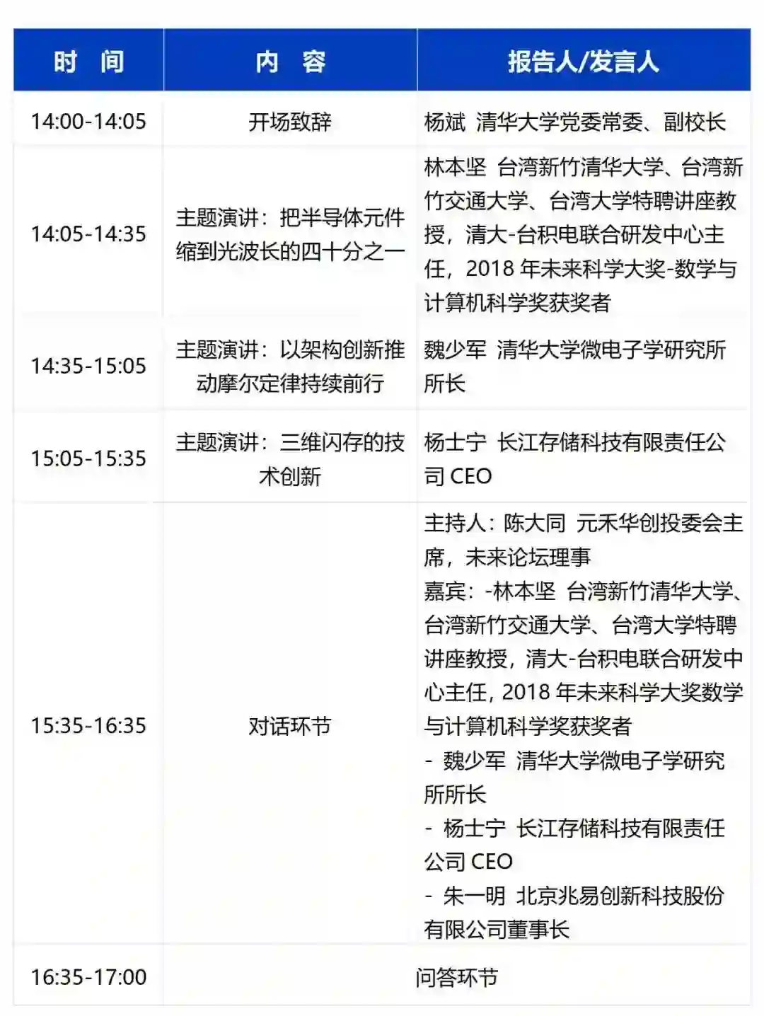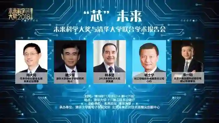 2018年11月19日,清华大学将联合未来科学大奖,特邀2018年未来科学大奖-数学与计算机科学奖获奖者、台湾新竹清华大学、台湾新竹交通大学、台湾大学特聘讲座教授林本坚和清华大学微电子学研究所所长魏少军,长江存储科技有限责任公司CEO杨士宁,北京兆易创新科技股份有限公司董事长朱一明举办未来科学大奖与清华大学联合学术报告会。未来论坛理事、元禾华创投委会主席陈大同将作为对话环节的主持人,与四位重量级嘉宾共同参与讨论。