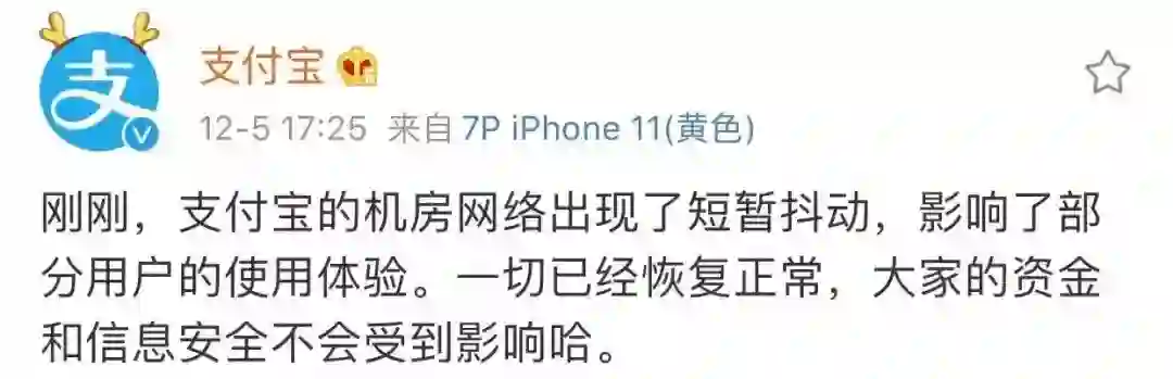 对此,支付宝回应称,支付宝的机房网络出现了短暂抖动,影响了部分用户的使用体验。