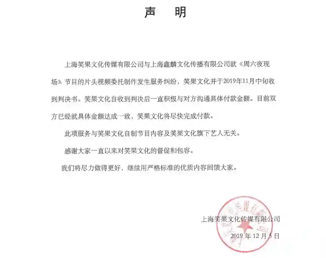 12月3日,《吐槽大会》、《脱口秀大会》等综艺节目的出品方——上海笑果文化传媒有限公司被上海市黄浦区人民法院列为被执行人,王思聪、李诞等在股东之列。对此,上海笑果文化传媒有限公司5日发表声明回应称,表示笑果文化与上海鑫麟文化传播有限公司就《周六夜现场》节目的片头视频委托制作发生服务纠纷,并于2019年11月中旬收到判决书。目前双方已经就具体金额达成一致。(第一财经)