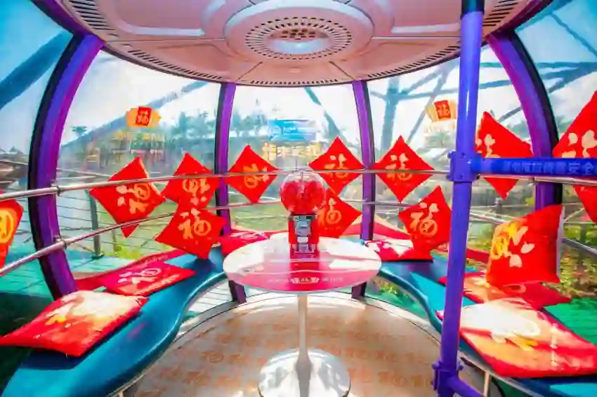 比如“三亚之眼”摩天轮开五福主题轿厢,乘客线上在支付宝搜抽福卡抢特惠票福利,线下在现场乘坐“福来运转”摩天轮俯瞰三亚。
