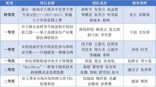 2017年11月14至19日,由共青团中央、中国科协、教育部、中国社会科学院、全国学联、上海市人民政府共同主办的第十五届“挑战杯”全国大学生课外学术科技作品竞赛终审决赛在上海大学举行。经过激烈角逐,南京大学以团体总分390分位列全国高校第5位,捧得“优胜杯”。入围全国决赛的6件作品分获特等奖1项、一等奖3项、二等奖2项。此次比赛,我校团体总分、入围作品数量、一等奖获奖数量均达到历史最好水平,其中文科作品实现了特等奖零的突破。
