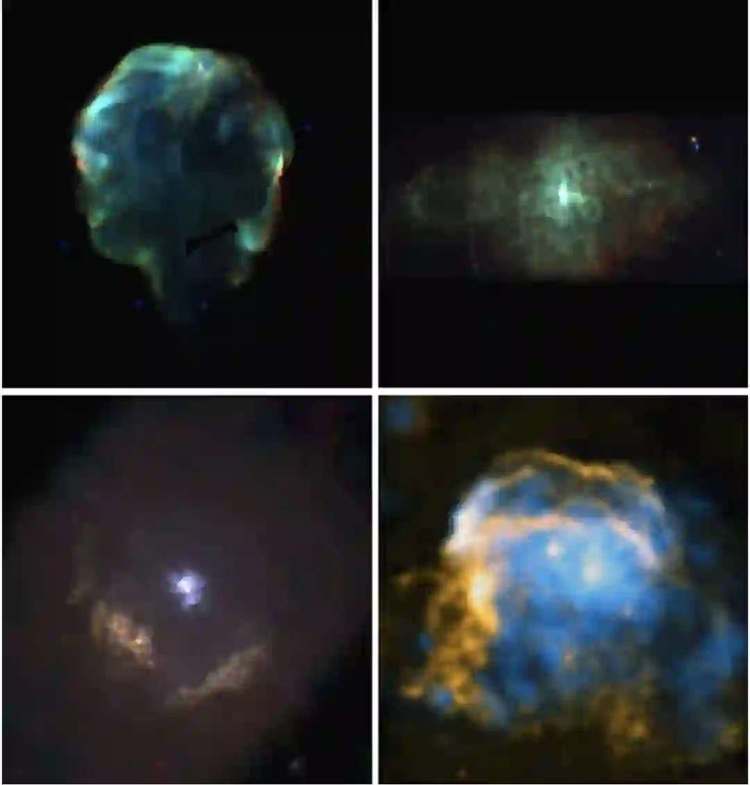 从形态学上,根据射电和X射线波段的图像,超新星遗迹如今分为四类。第一类是壳层型,即呈环状结构,壳层增量,中心暗弱。这类遗迹占了绝大多数。第二类是实心型,指中心最亮,边缘暗弱的遗迹,其典型代表是蟹状星云,因而又称类蟹状星云型。第三类是混合型,既有明亮的壳层,又有明亮非热辐射中心。第四类是热混合型,这类是近三十年随着X射线望远镜的发展新确认的一批遗迹,其特征是非热射电壳层加热X射线中心。图4给出了四类遗迹的示例图片。
