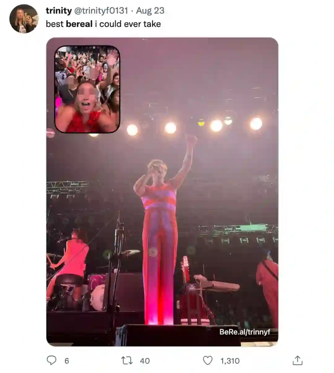 有用户在Twitter上放出自己的BeReal照片。他们利用双摄像头同时拍照的功能让自己和舞台上的偶像轻松同框,
