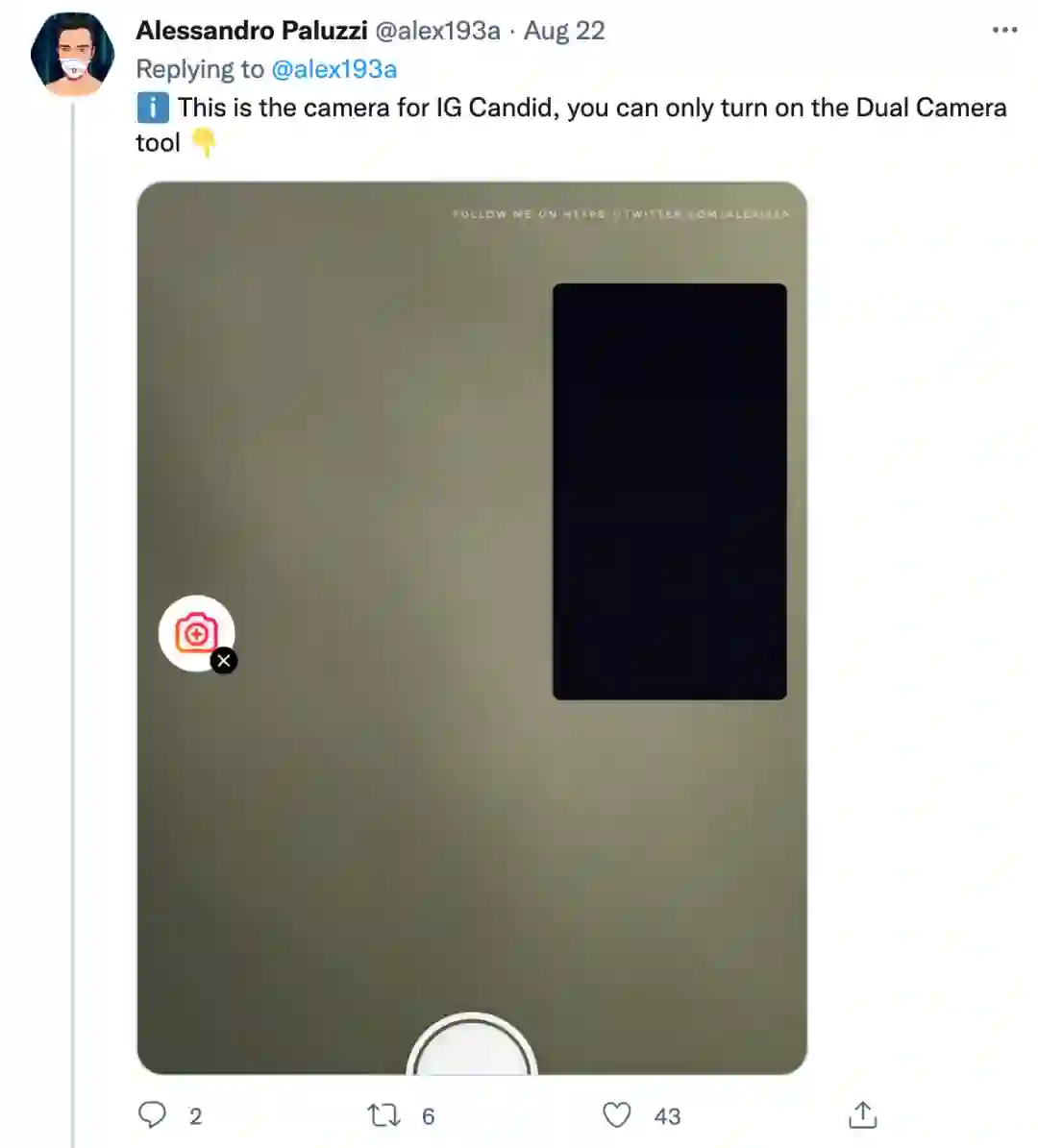 爆料人Alessandro Puluzzi甚至在个人Twitter上放出了Instagram正在内测的双摄像头同时拍摄的功能截图。