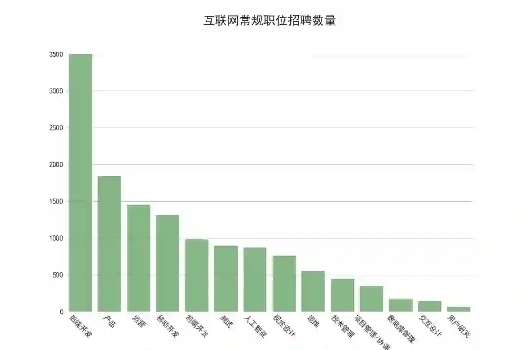 常规互联网职位分布如下图,其中后端开发、产品和运营职位数量排名前三,排名未变。