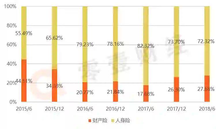 2015H-2018H,互联网保险业务中,人身险为互联网保险收入的主要构成一般在七成左右(见图2)。