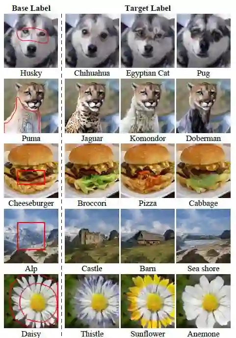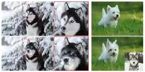图8 特征混合方法的标签拼贴结果。其中,红色帧区域内的特征被混合到基础图像中。