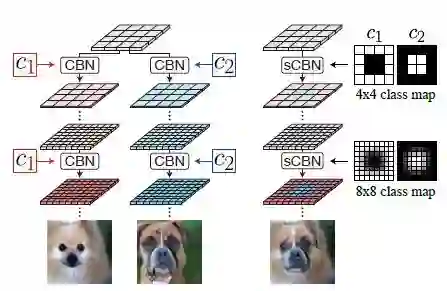 其中, sCBN 基于用户所指定的混合系数 (标签拼贴(label collaging)) 的空间映射图,允许用户融合多标签的语义信息。